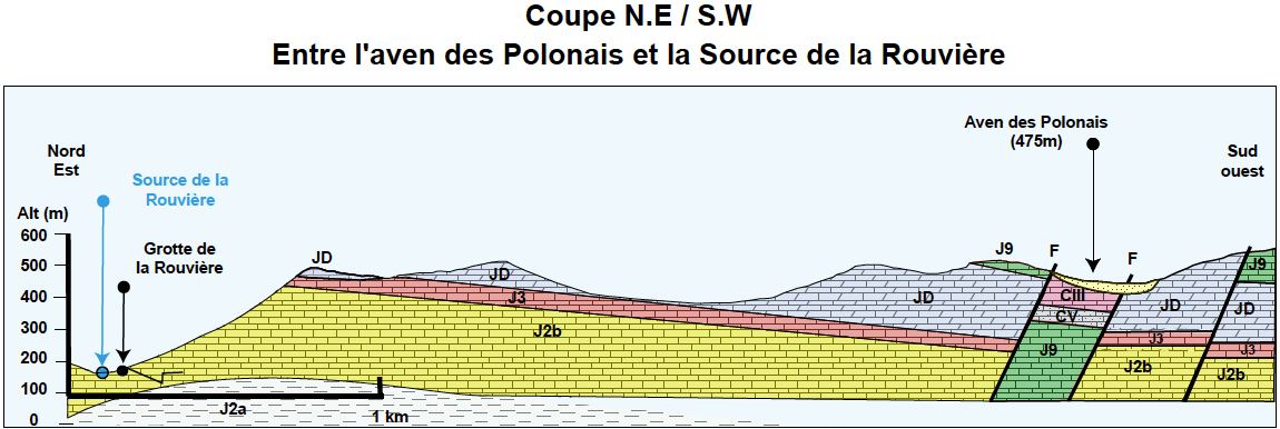Coupe N.E/S.W entre l’aven des Polonais et la Source de la Rouvière, cliquer dessus pour l’agrandir