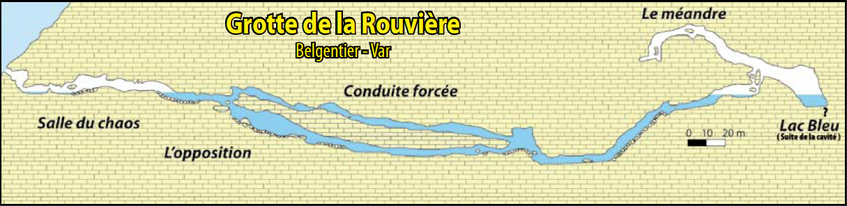 La Grotte de la Rouvière où après une désobstruction de l’Abîme Club Toulonnais en 1964, puis des plongées en 1967 et 68, 530 mètres de galeries ont été explorées. Le dernier siphon a été plongé jusqu’à une profondeur de 46 mètres (clique dessus pour l’agrandir).