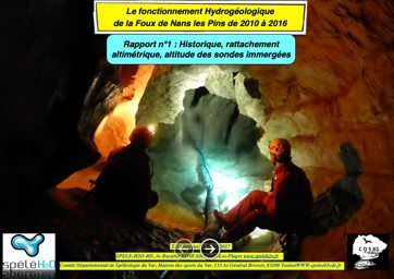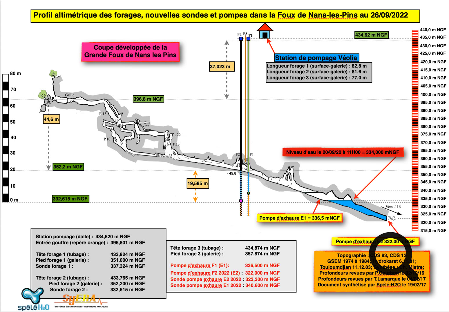Nous connaissons aujourd'hui l'altitude exacte des 3 sondes immergées de Véolia, des 2 forages F1 et F2 (tête et pied de tubage), des 2 pompes d'exhaure E1 et E2, de l'entrée du gouffre, des émergences "les Filles", et du forage Rondoline S3.