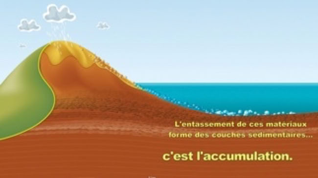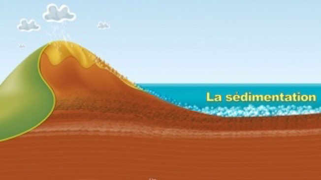 - les résidus issus de l'érosion, tels que les minéraux, les fragments de roche et tout matériaux solubles sont emportés par les cours d'eau et parfois le vent au fond des lacs, des mers où des océans.