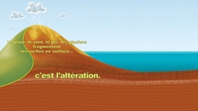 - la pluie, le vent, le gel, les glaciers fragmentent les roches anciennes en surface par altération.