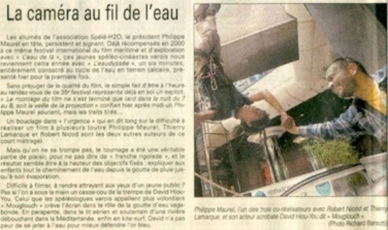 Il utilisera toute la logistique des sports extrêmes pour faire son cycle (parapente, eau vive, canyoning, rap jumping, spéléologie, plongée sous-marine et kite surf) en faisant découvrir les différentes étapes (la pluie, le ruissellement, l’infiltration, la résurgence et l’évaporation). Bref, c’est l’histoire de l’eau et du calcaire depuis la nuit des temps.