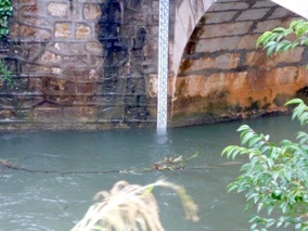 En basses eaux, la lecture pourra se faire en bas du pont. A noter que la section de l’échelle n’est pas favorable à la mesure de bas débit, absence de seuil pour les contrôler et les jauger, le zéro de l’échelle n’étant pas en dessous du niveau des plus basses eaux connues (un affouillement et une mouille risquent de perturber les mesures, du coup la relation hauteur-débit à l’étiage risque de ne pas être biunivoque).