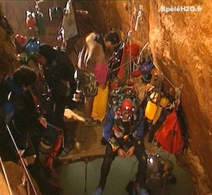 Le gouffre se divise en trois parties, la première est verticale et à sec (-45 m depuis le zéro de l’entrée), la deuxième est verticale et noyée (-74 m), puis vient une large galerie sur une centaine de mètres qui aboutit à un vaste volume noyé. Les plongeurs ont touché le fond à la cote - 151 mètres, ils n’ont pas trouvé de suite.