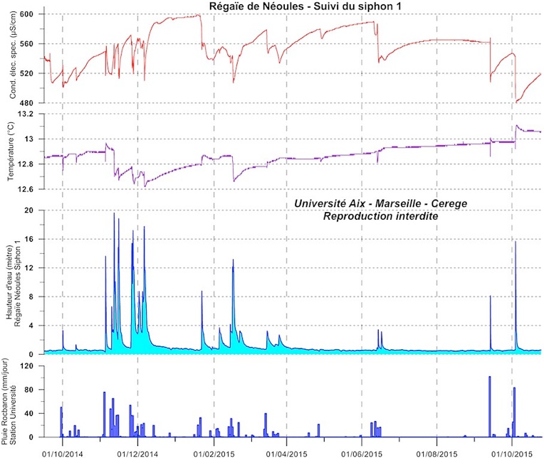 Une sonde de mesure CTD enregistrant la Conductivité électrique, Température, et hauteur d'eau fut installée dans la grotte du Regaïe de Néoules. Le capteur a enregistré une série de paramètres physicochimiques de l'eau souterraine pendant plusieurs mois.