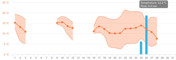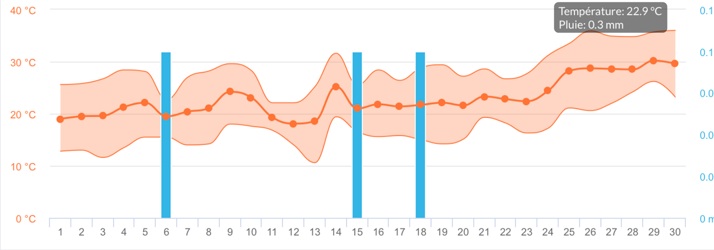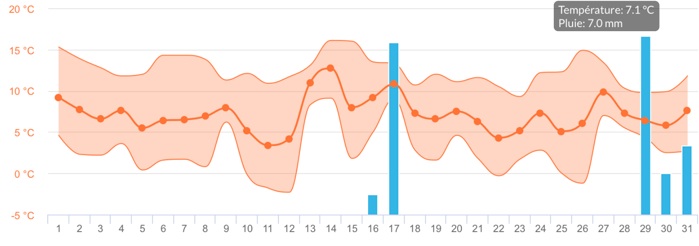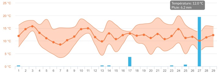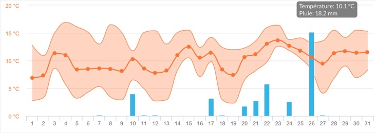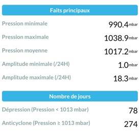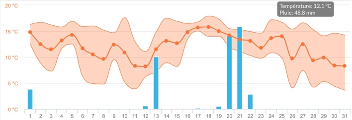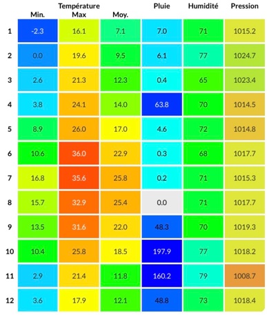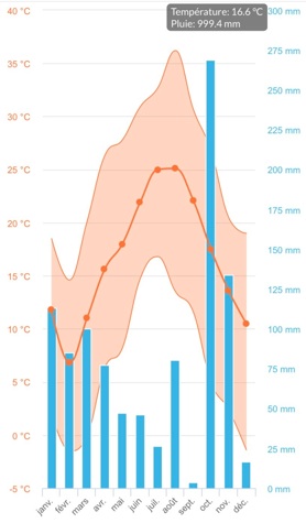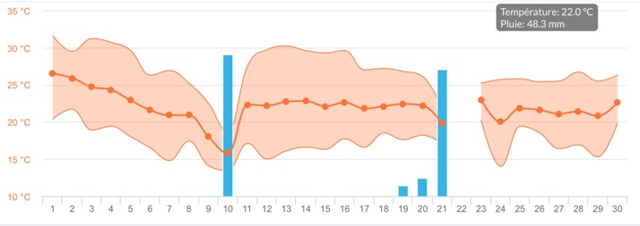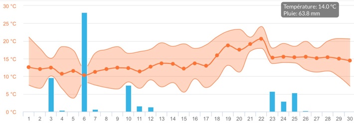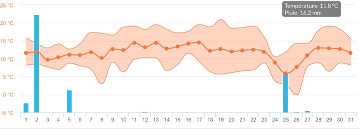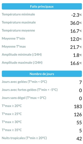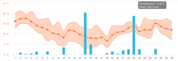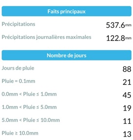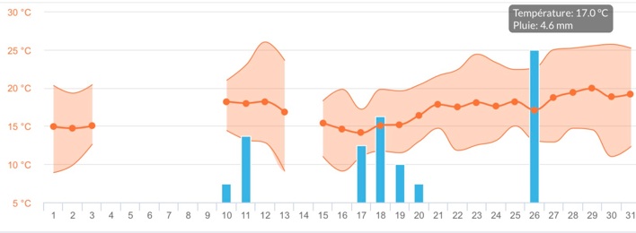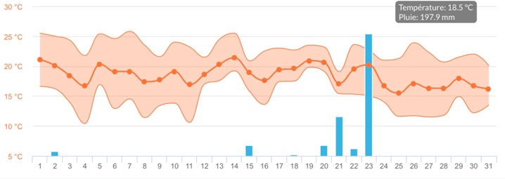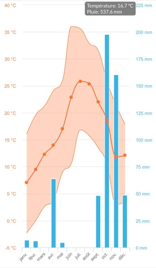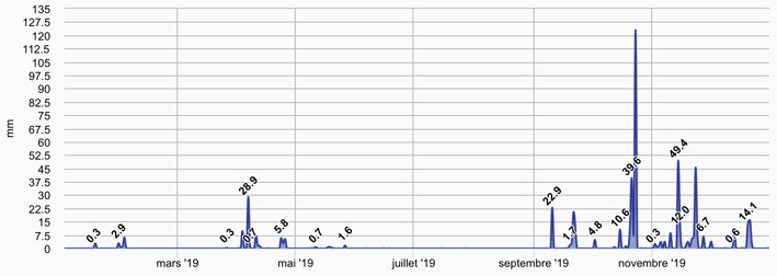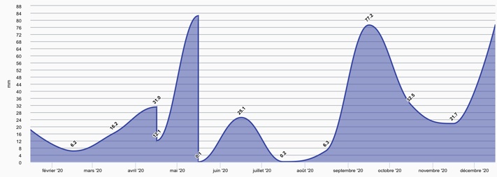 Ci-dessous les différentes données de pluviométrie et de température enregistrées en 2019 / 2020 par la station connectée Netatmo Bucarin / Six-Fours-Les-Plages.