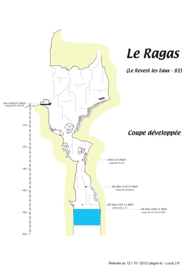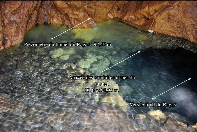 Niveau d’eau du Ragas le 05/10/12 : 92 m NGF. Il est 10h00, les plongeurs trouvent les 2 conduites des prises d’eau qui jonctionnent avec la galerie souterraine du Ragas.
