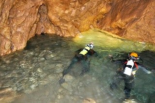 Les plongeurs de ScaphteK mettent en place un ballon gonflable dans la conduite de drainage du bouchon amont dans le tunnel du Ragas.