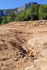 Le 21 septembre, nous profitons de la mini-pelle pour désobstruer la source de la Grande Foux. En creusant profondément, on retrouve assez rapidement l’eau qui représente le niveau d’eau piézométrique de la source. Par contre, on ne retrouve pas le siphon, ni sa galerie naturelle..