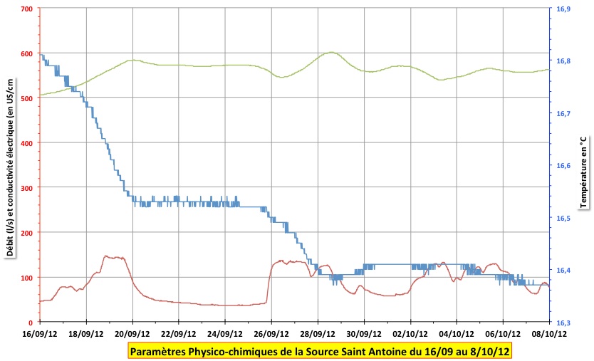 -Par contre, on remarque des fortes variations de la conductivité électrique et du débit à la source Saint Antoine (schémas 2). Ces variations seraient issues des nombreuses pertes se situant dans le cours d’eau du Las, influencées par les différents débits d’eau de rejet du pompage Ragas.