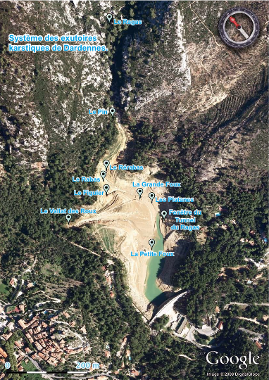 Les eaux souterraines de ce système karstique aboutissent dans la retenue de Dardennes via différents exutoires (le Ragas, la grande et petite Foux, le Figuier, le Rabas, le Rerabas, les Platanes, le Renard, la Route, l'Olivier, la Rebonne et le vallat des Roux.