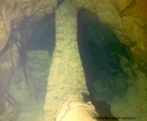 Le 15 septembre, nous descendons le ROV de l’entreprise Syera afin d'explorer le siphon et vérifier la cohérence des plans tirés des archives historique. La visibilité est très mauvaise mais la morphologie du siphon est tout à fait semblable aux plans dont nous disposons.