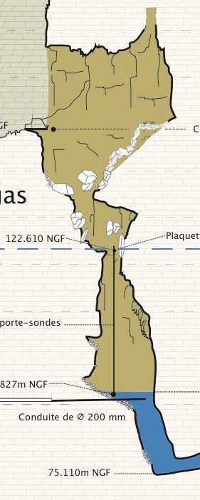 -En dessous de la cote 100m NGF, la retenue n’est plus connectée hydrauliquement au gouffre du Ragas. Le niveau de base de ce système est constitué par les sources pérennes du Platane, et de la grande Foux (102m NGF).