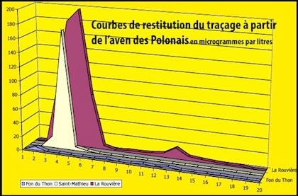 Les traçages positifs effectués à partir de l’aven des POLONAIS montrent une nouvelle fois la diffluence des circulations sous forme de delta. La ROUVIERE et ST MATHIEU d’une part, la FONT DU THON et la source WERROTE d’autre part se sont teintées en rouge…