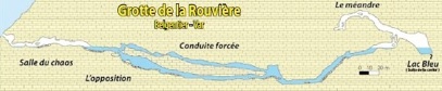 La Grotte de la Rouvière où après une désobstruction de l’Abîme Club Toulonnais en 1964, puis des plongées en 1967 et 68, 530 mètres de galeries ont été explorées. Le dernier siphon a été plongé jusqu’à une profondeur de 46 mètres (clique dessus pour l’agrandir).