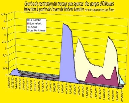 Comme précédemment, les colorations furent accompagnées dʼinjection dʼeau de 2 à 4 m3 par les pompiers du Var. De nombreuses sources furent surveillées. Etant effectuées dans un intervalle de temps restreint, les colorations à Maramoye et à Robert Gauthier furent faites avec deux traceurs différents : fluorescéine au premier et Rhodamine au second. Les tests furent positifs dans les sources de la Vallée de la Reppe que le colorant mit trois mois à atteindre. Quant à la Foux de Ste Anne, n’étant pas en crue, on ne put la tester au même moment. Un nouveau traçage fut effectué au fond de l’Aven des Ajoncs, le 1er février 1998, mais avec un traceur différent : l’Acide Amino G. Trois mois après, le colorant ressortait simultanément aux sources de la Reppe et à la Foux, fort heureusement en crue ce jour là. La ressortie à la Foux fut particulièrement significative.