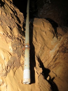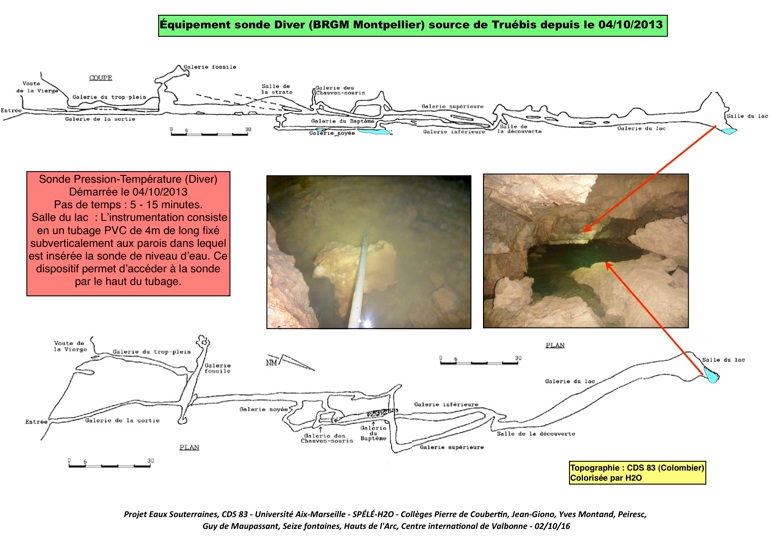 Comme la grotte de Truebis est une source temporaire, l’idée a été d’instrumenter directement le drain noyé au niveau du siphon (salle du Lac) pour pouvoir mesurer les fluctuations des niveaux d’eau toute l’année, même en période sèche. La salle du Lac dans la grotte de Truebis a été équipée le 04/10/2013. L’instrumentation consiste en un tubage PVC de 4m de long fixé sub-verticalement aux parois dans lequel est insérée la sonde de niveau d’eau. Ce dispositif permet d’accéder à la sonde par le haut du tubage. C’est une sonde diver, qui mesure la pression et la température. Le dispositif a été déplacé le 06/09/16 car la sonde était souvent hors d’eau, notamment l’été. Elle se trouve donc actuellement bien plus basse que sa position initiale.