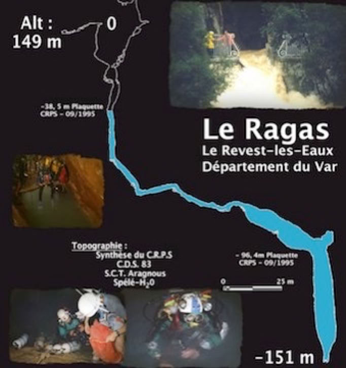 La plongée de 1989 au Ragas avait laissé un gros point d’interrogation. L’objectif de Jean-Jacques Bolanz était d’atteindre le fond du siphon, ce qu’il avait réussi à faire. Par contre, le haut du grand puits noyé n’avait pas été vu et il était intéressant d’aller vérifier s’il ne comportait pas des départs ou une remontée à l’air libre.