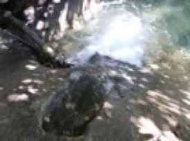 Par contre, 300 m en amont de la salle verte arrivent des eaux chaudes en rive droite du Las (les sources Paridon) dont nous évaluons le débit à environ 25 l/s, la conductivité électrique et la température du cours d'eau changent. À notre sens, il n'y a pas de zone de perte sur le Las amont.
