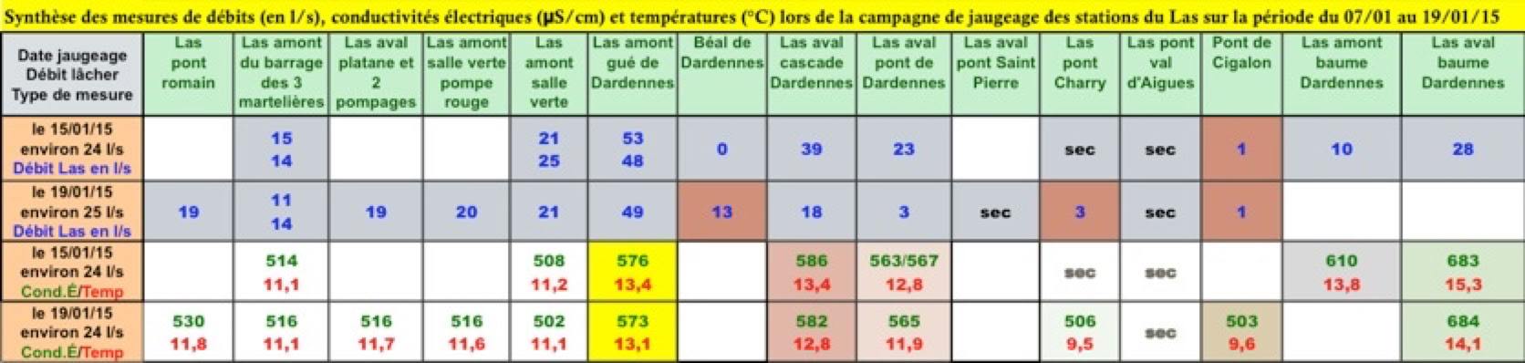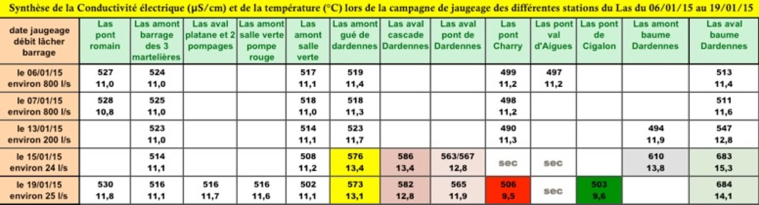 Pour les débits de fuite à 24 l/s (le 15 et 19/01/15), les conductivités électriques et températures sont similaires entre elles (en fonction des stations) sur les 2 périodes de mesures, par contre elles diffèrent à partir de la station "Las amont salle verte" (530 à 508 μS/cm) et notamment sur la station "Las amont gué de dardennes" (case jaune), "Las amont Baume de Dardennes" (cas grise) et "Las aval baume de Dardennes" (case verte pâle). Ces différences s'expliquent par la présence de sources occultes, nous y reviendrons dans le chapitre qui précède.