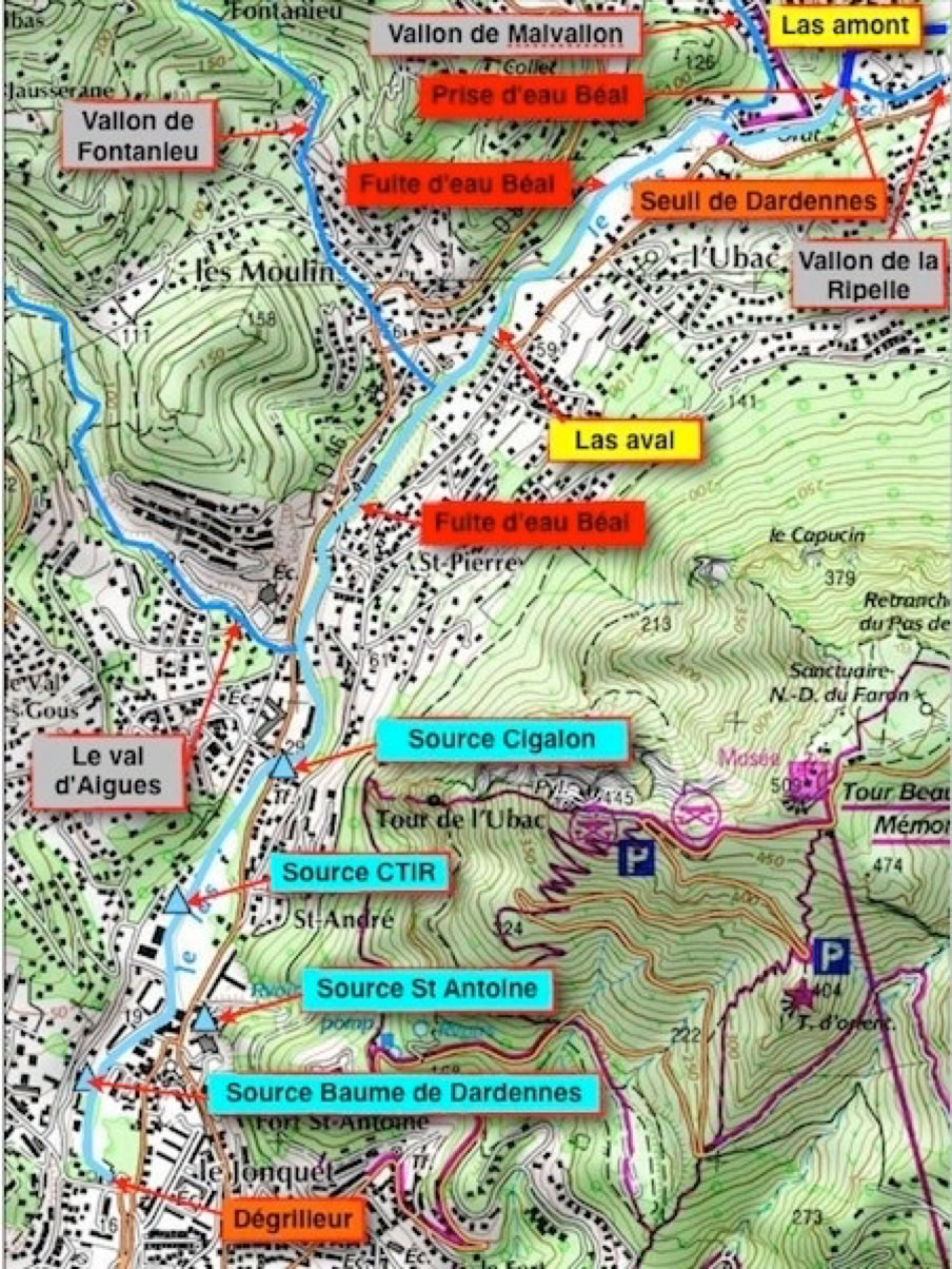 Au niveau du seuil de Dardennes, l’eau est déviée au profit du vieux Béal qui jadis participait à l’alimentation en eau pour les industries et l’agriculture toulonnaise.