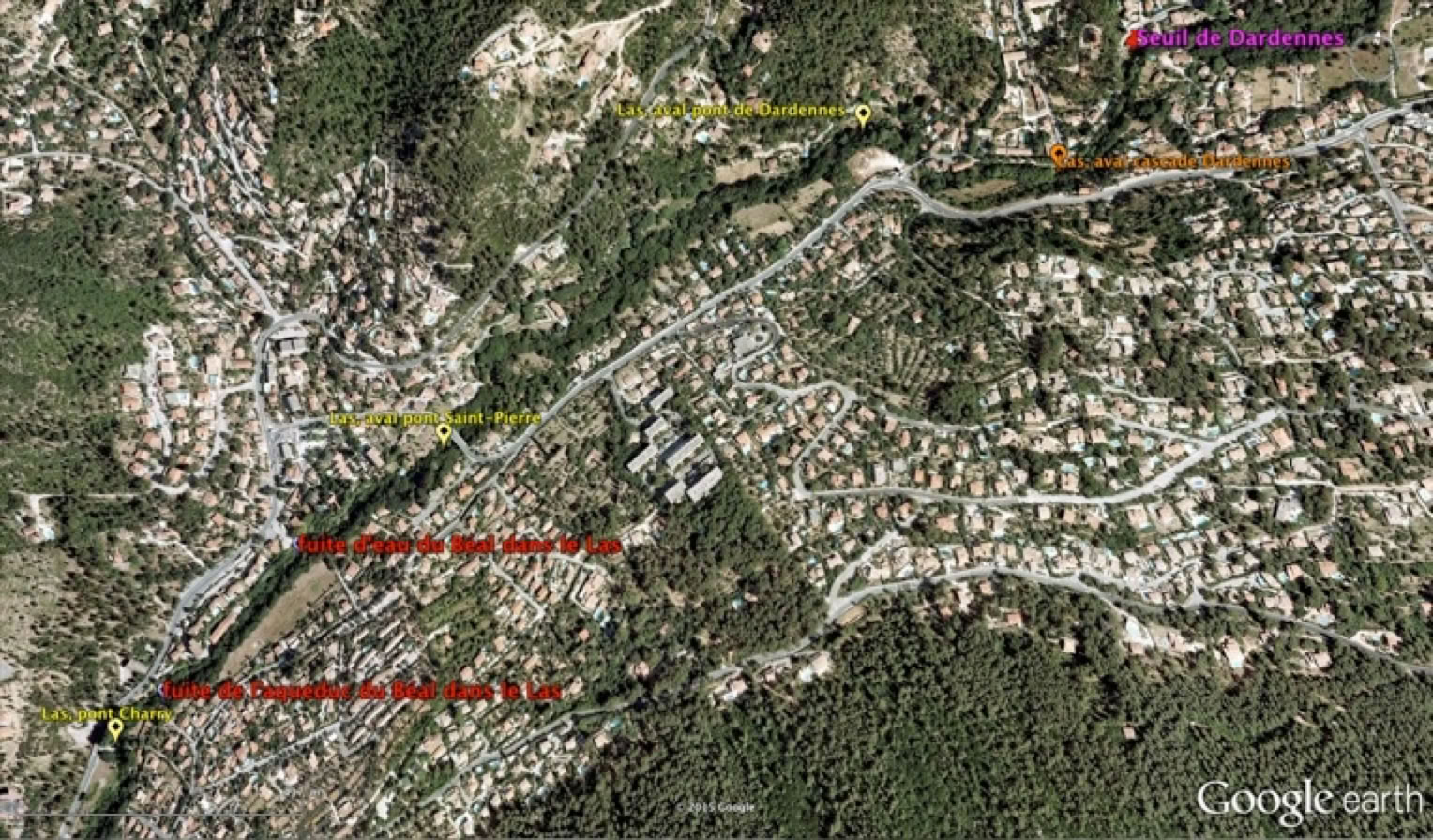 Au niveau du seuil de Dardennes, une partie de l'eau du Las amont est déviée dans le Béal. Selon la saison (estivale) où selon son débit (étiage), elle est presque entièrement captée. Cependant, le Béal qui longe la rivière fuit à 2 endroits distincts et rejette de l'eau dans le Las aval. Nous avons étudié ces 2 fuites, elles se trouvent entre le pont St Pierre et le pont Charry.