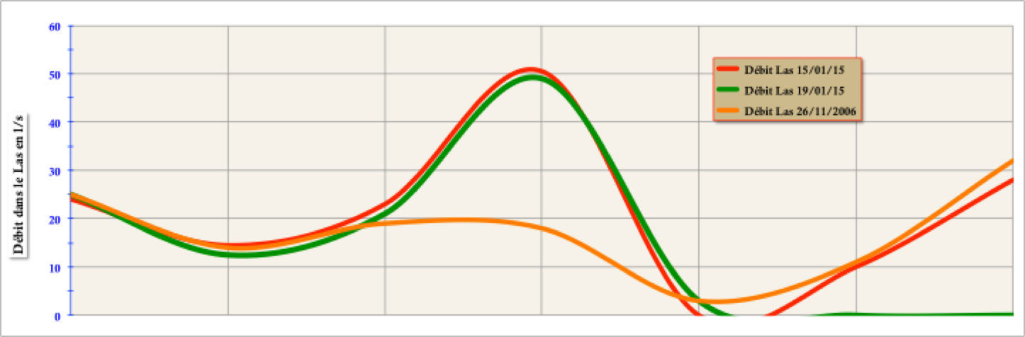 -Du 08/01/15-10h30 au 13/01/15-17h05, nous avions un débit constant d'environ 200 l/s (estimé par Véolia, vanne à 15%).