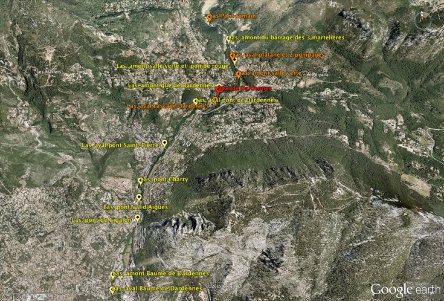 La campagne de mesure des débits s'est déroulée le 7/01/15 (7 jaugeages), le 13/01/15 (15 jaugeages), le 15/01/15 (10 jaugeages) et le 19/01/15 (11 jaugeages). Nous avons effectué 43 jaugeages sur 15 stations de mesures, nous les avons localisés sur une carte :