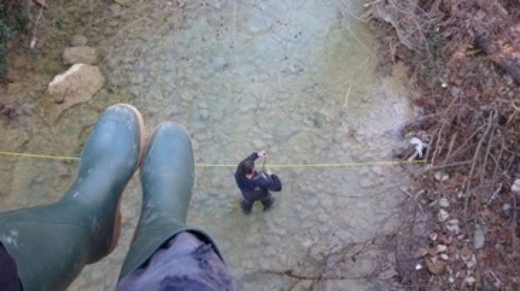 Sur le cours d'eau du Las, entre la retenue et le dégrilleur du jonquet nous effectuons plusieurs jaugeages tout en mesurant la conductivité électrique et la température sur une multitude de stations.