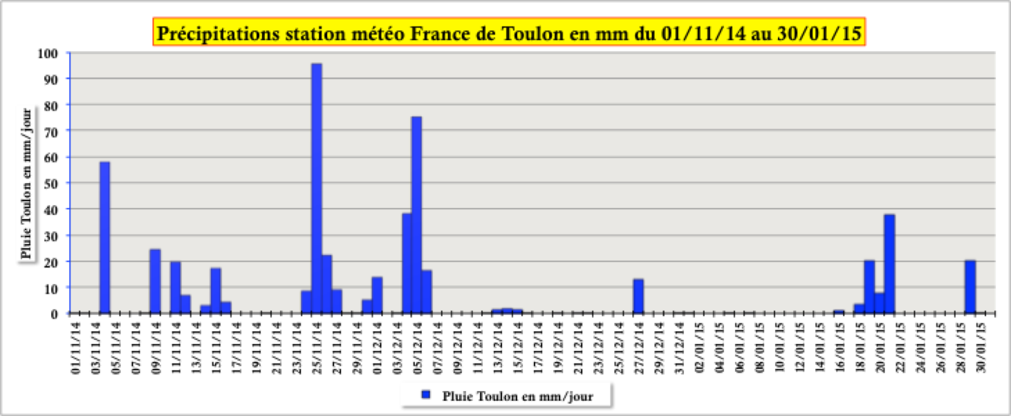 -De fortes précipitations au mois de novembre 2014 (278 mm) et début décembre 2014 (144,8 mm du 01 au 06/12/15). Ces précipitations ont pour conséquence de recharger la nappe alluviale du Las et de remplir totalement la retenue de Dardennes (côte 123mNGF).