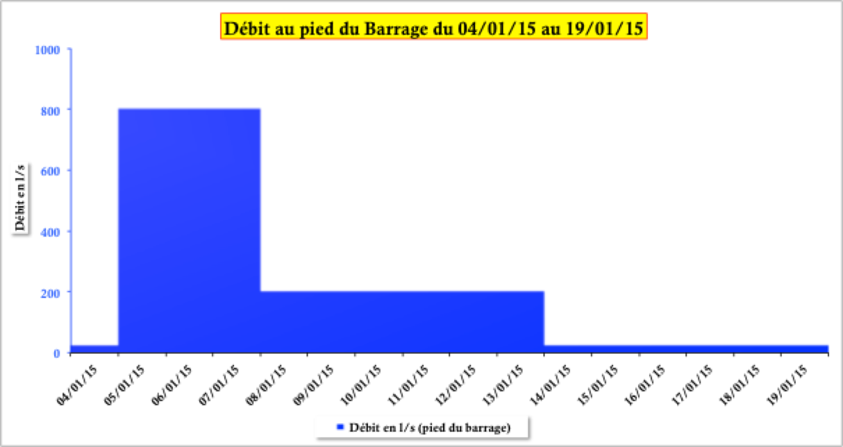 -Du 01/01/15 au 05/01/15-10h30, nous avions un débit limité aux fuites du barrage et au lavage des filtres : pas de données.