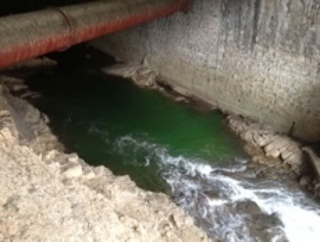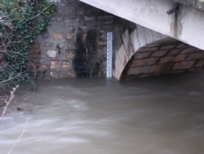Les quelques photos qui vont suivre montrent que le niveau d’eau le plus haut atteint par 3 fois lors de notre campagne de jaugeage (décembre 2013 et janvier 2014) est en dessous de la réalité. Il s’agit d’un niveau d’eau dit "normal" et qui fait suite à des écoulements de crues banales. D’ailleurs les relevés de hauteur d’eau de la sonde de pression de l’IRSN n’a jamais dépassé les 180 cm en l’espace de 2 ans.