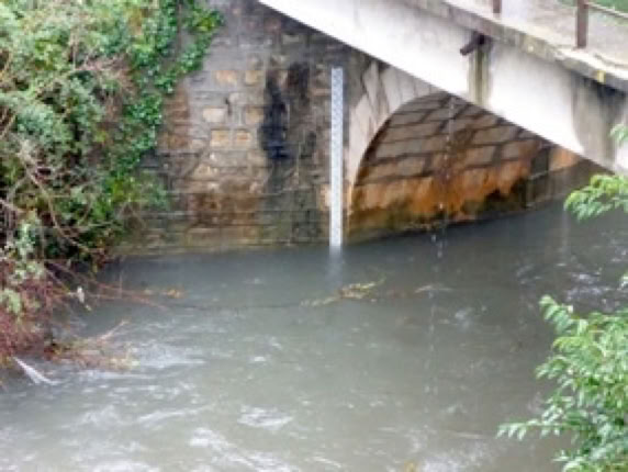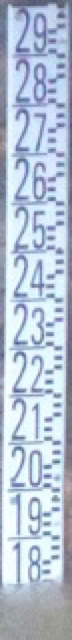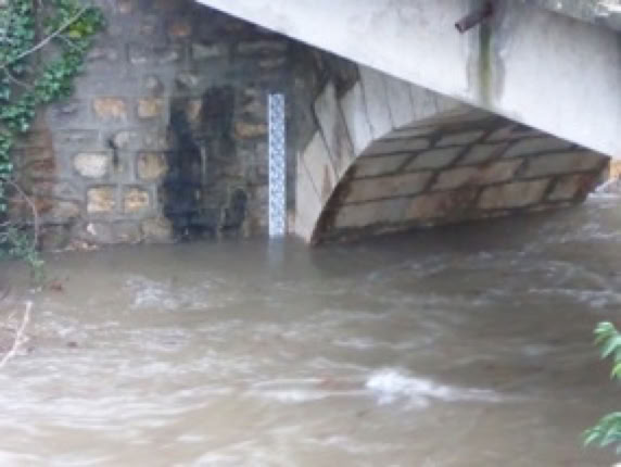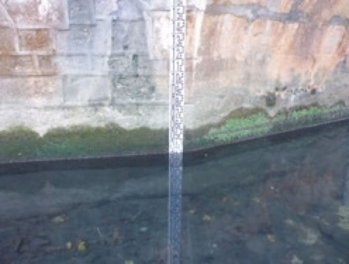 En basses eaux, la lecture pourra se faire en bas du pont. A noter que la section de l’échelle n’est pas favorable à la mesure de bas débit, absence de seuil pour les contrôler et les jauger, le zéro de l’échelle n’étant pas en dessous du niveau des plus basses eaux connues (un affouillement et une mouille risquent de perturber les mesures, du coup la relation hauteur-débit à l’étiage risque de ne pas être biunivoque).