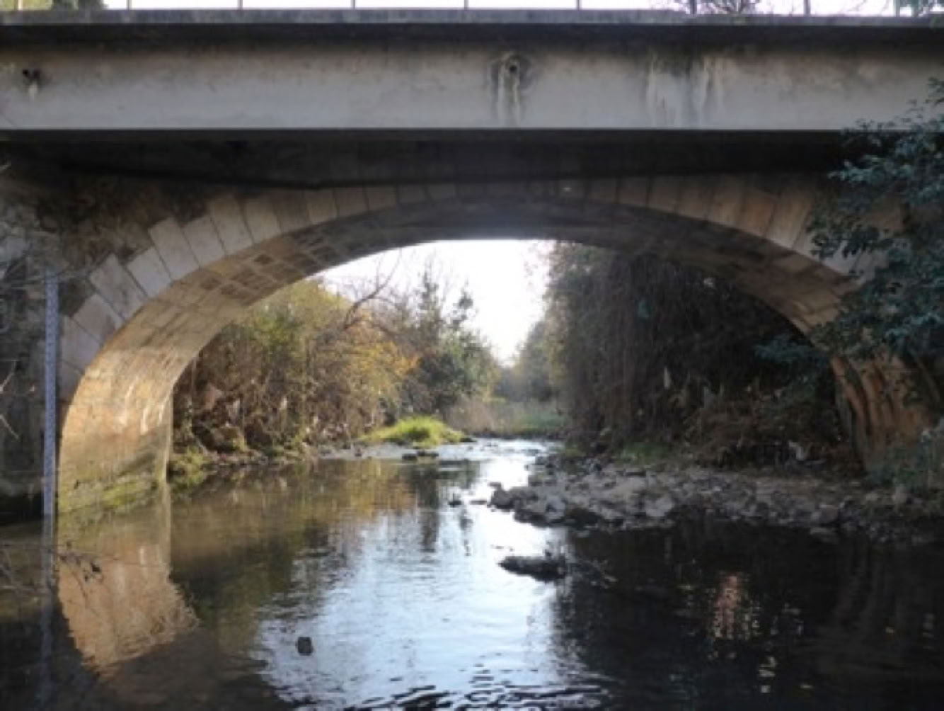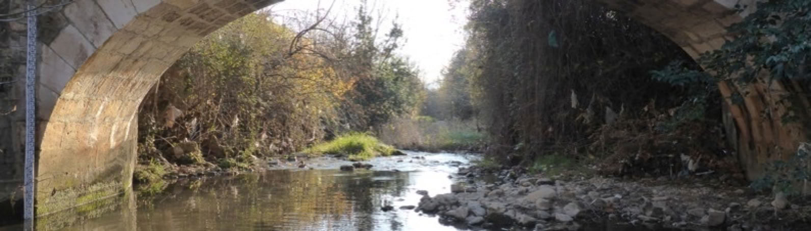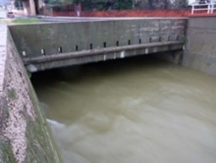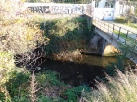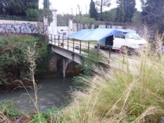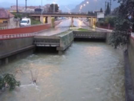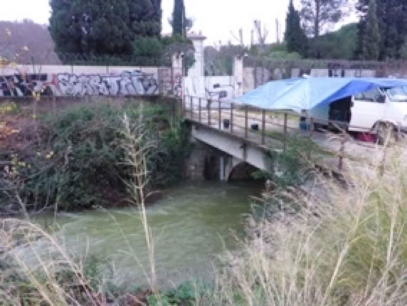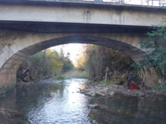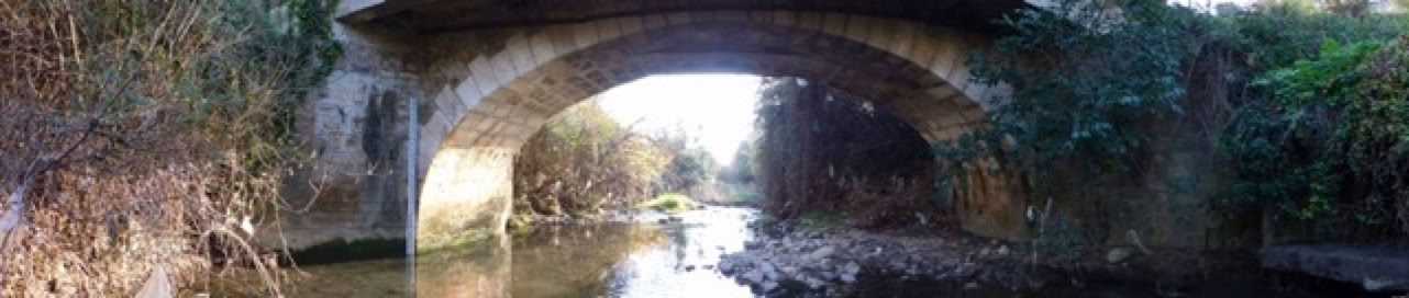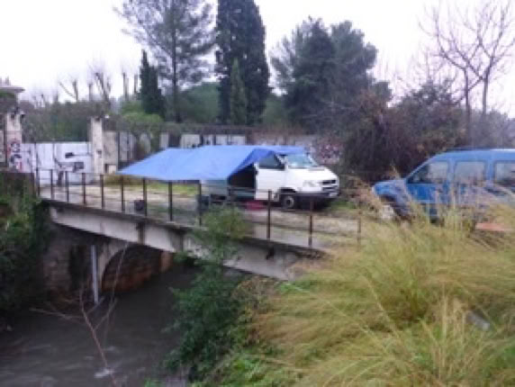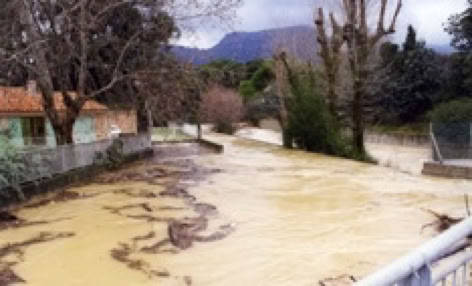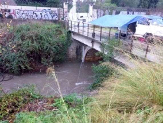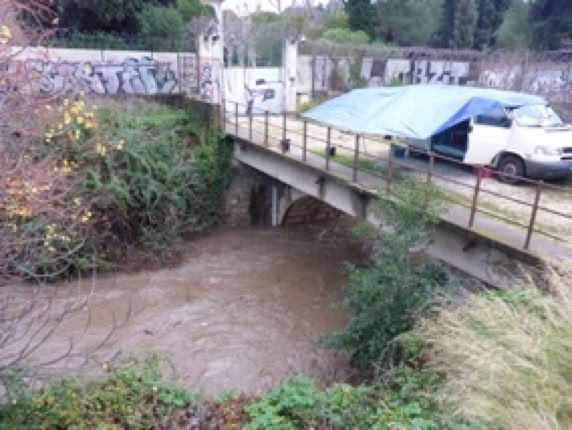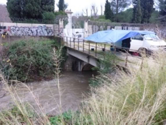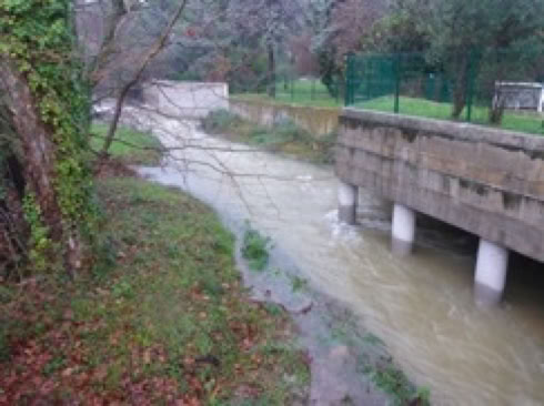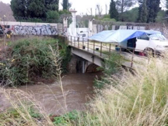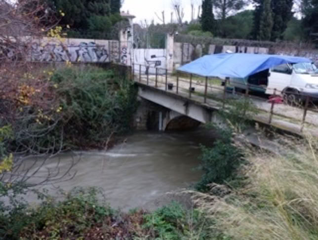 La crue du Las de 1999 (photos du dessus) montre un niveau d’eau supérieur à celle du 19 janvier 2014 (photos du dessous). La hauteur d’eau sur l’échelle Ifremer de la station pont de Lagoubran était d’environ 180 cm lorsque nous avons pris ces photos (19/01/14 entre 8h15 et 8h30).