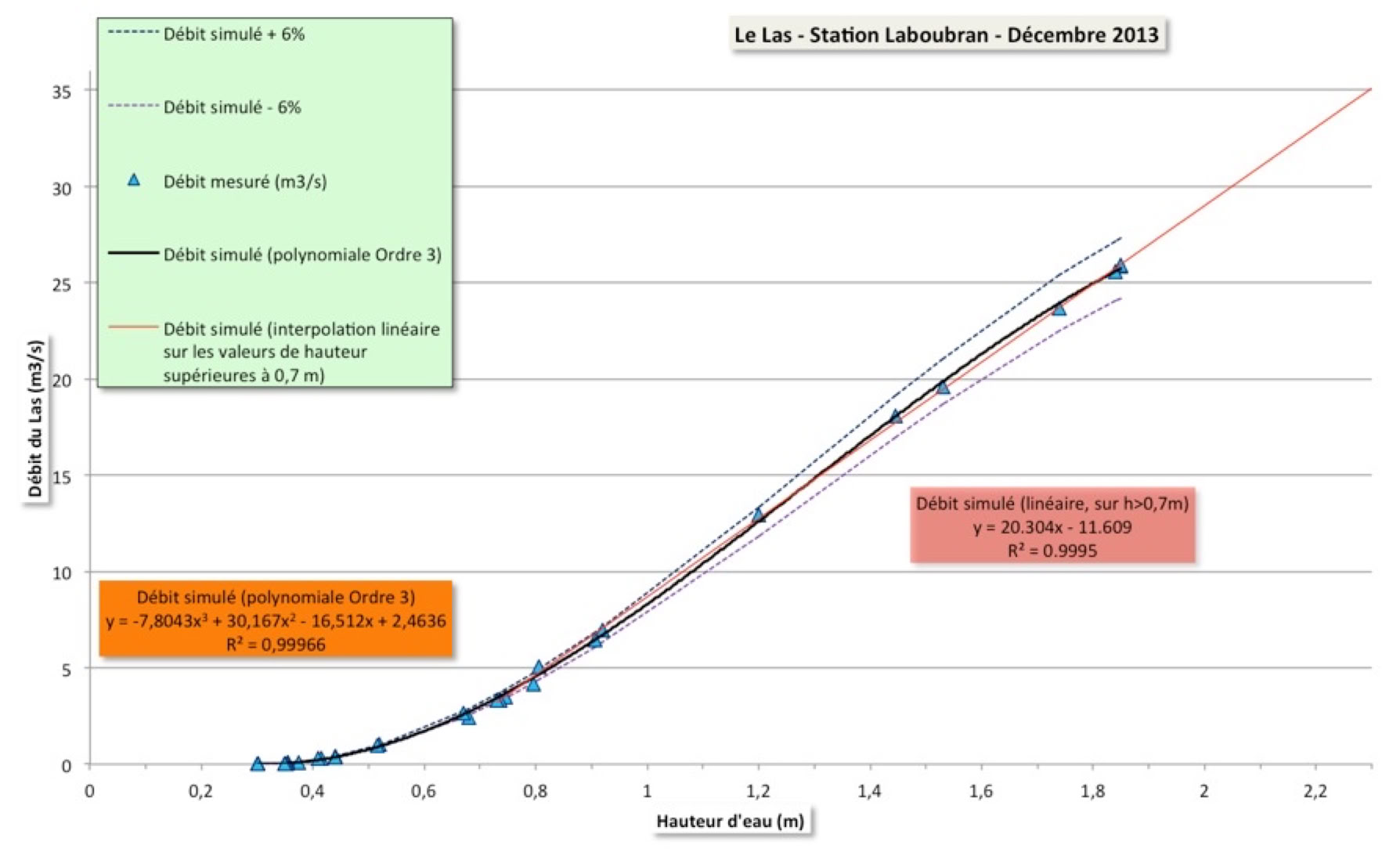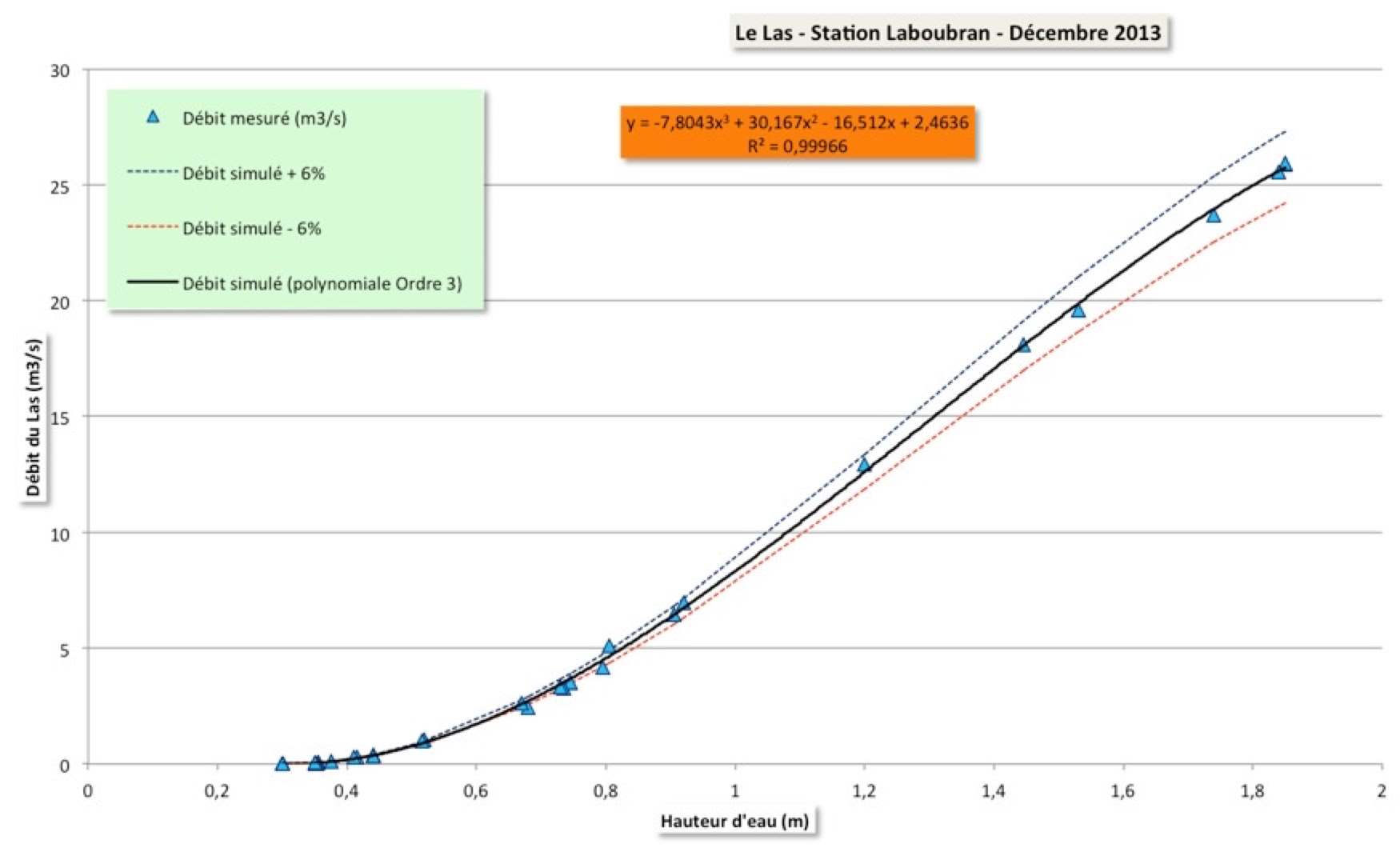 Pour la suite de ce compte rendu et pour l'équation générale de tarage, nous estimons que les bas, moyens et hauts débits ont été mesurés avec une précision de l’ordre de +/- 6%. (voir calcul dans le rapport)
