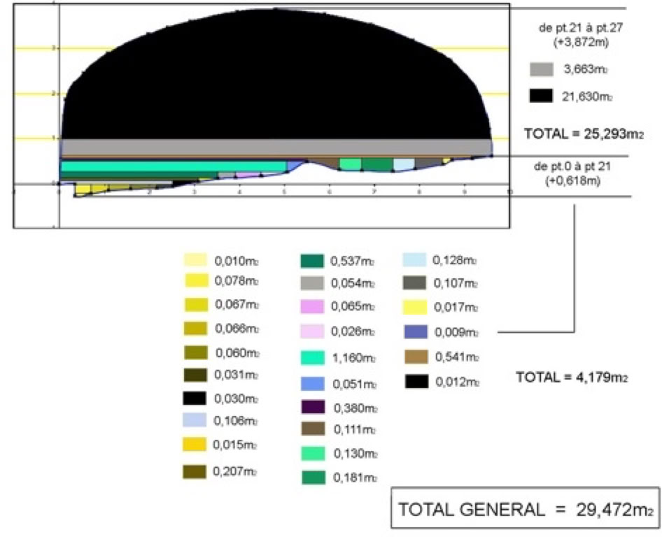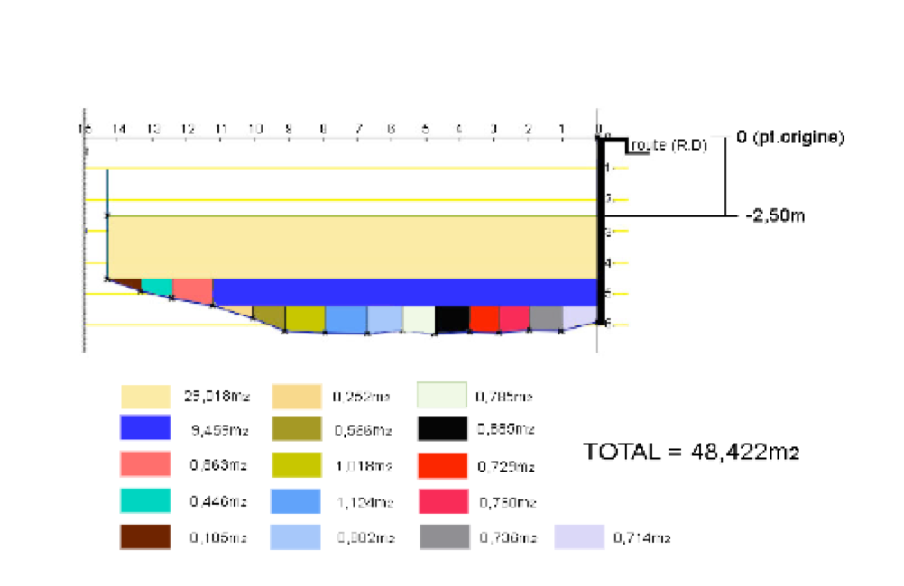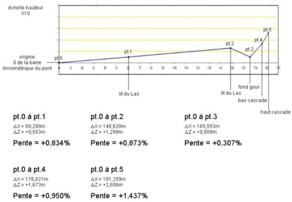 Pour définir au mieux cette relation (surface de la section) et notamment dans la durée (on pourra vérifier que la section n’évolue pas dans le temps), nous avons établi 2 profils transversaux (section de la station règle Ifremer et section d’une autre station en amont du pont) et une coupe longitudinale (Règle Ifremer - amont seuil cascade). L’ensemble des tronçons ainsi que le linéaire ont été mesurés au théodolite.