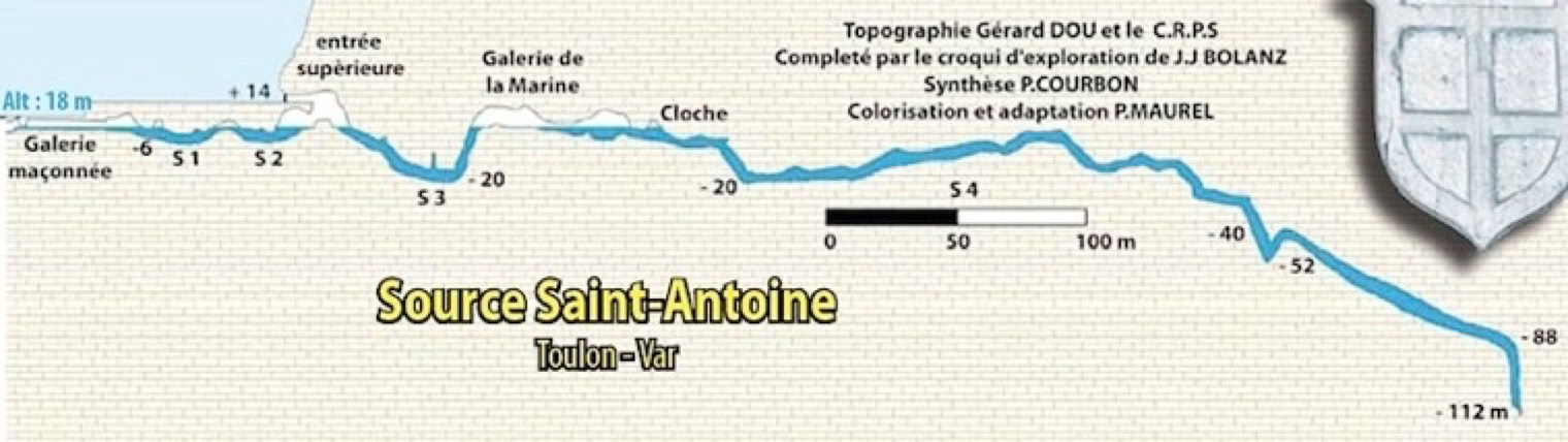 En 1982, le GRPS et Claude Touloumdjian plongent dans le siphon 4 sur une longueur de 340 m, atteignant la profondeur de 88 m. La galerie continue toujours, verticalement, sans qu’on en voie le fond.