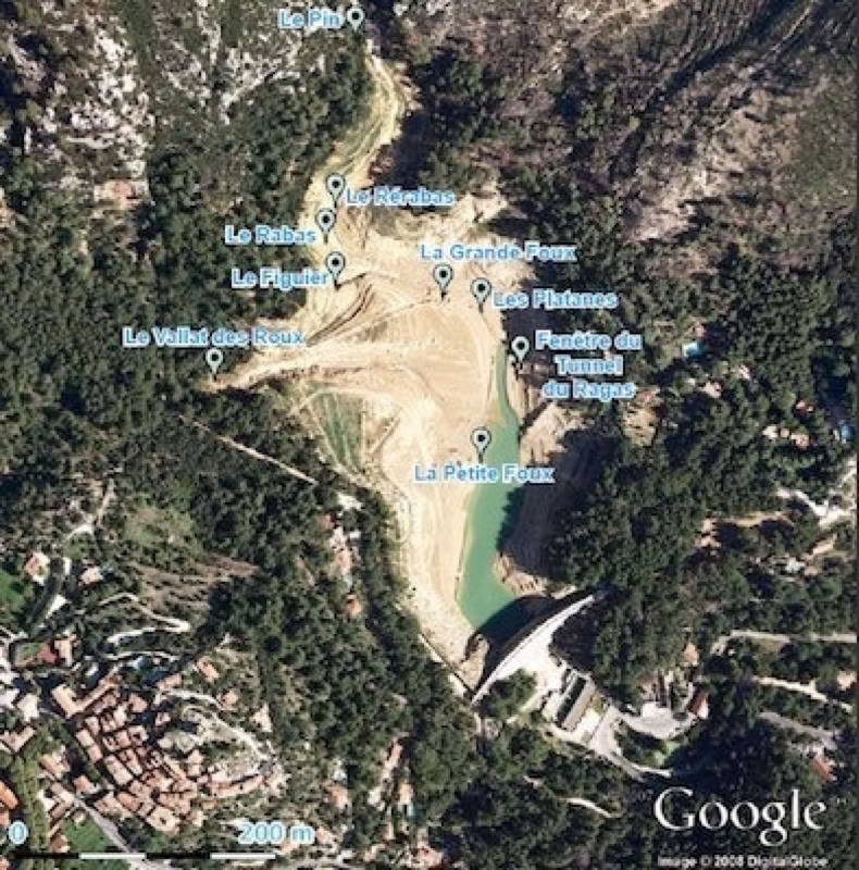 Aujourd’hui, certains de ces exutoires ne sont plus visibles comme la Grande Foux (102,4 m), la petite Foux (96,3 m), le Figuier (106,7 m), le Rabas (109,3 m), le Rerabas (110,3 m), les Platanes (101,512 m), le Renard (108,5 m), la Route (107,4), l’Olivier (117,2 m) et la Rebonne (103,10 m).