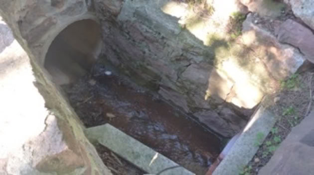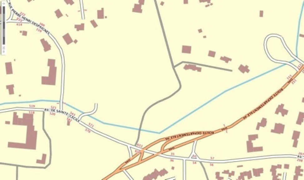 Cependant l'eau du trop-plein s'écoule en contrebas de la propriété au niveau de l'impasse des 3 Cèdres où se trouve d'ailleurs du travertin (voir photo ci-dessous) pour aboutir au ruisseau de l'impasse Calendau.