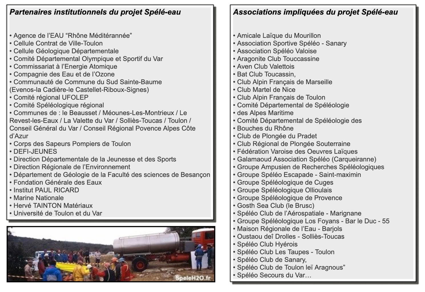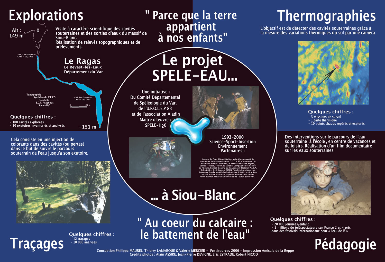 Le projet SPELE-EAU voit le jour à lʼinitiative du Comité Départemental de Spéléologie du Var, de lʼUFOLEP 83 et de lʼassociation Aladin. Il sʼagit de mettre en oeuvre une étude du karst et de ses circulations souterraines associée à un dispositif pédagogique et dʼinsertion en concertation avec les collectivités locales, associations et populations. Cʼest lʼassociation SPELE-H2O, créée en 1994 qui assure la mise en oeuvre du programme qui sʼest achevé en 2001. Le projet SPELE-EAU, initié par le Comité Départemental de Spéléologie du Var, l’UFOLEP 83 et l’association Aladin, vise à étudier le karst et ses circulations souterraines tout en intégrant un dispositif pédagogique et d’insertion, en collaboration avec les collectivités locales, associations et populations. L’association SPELE-H2O, fondée en 1994, a mis en œuvre ce programme qui s’est terminé en 2001.