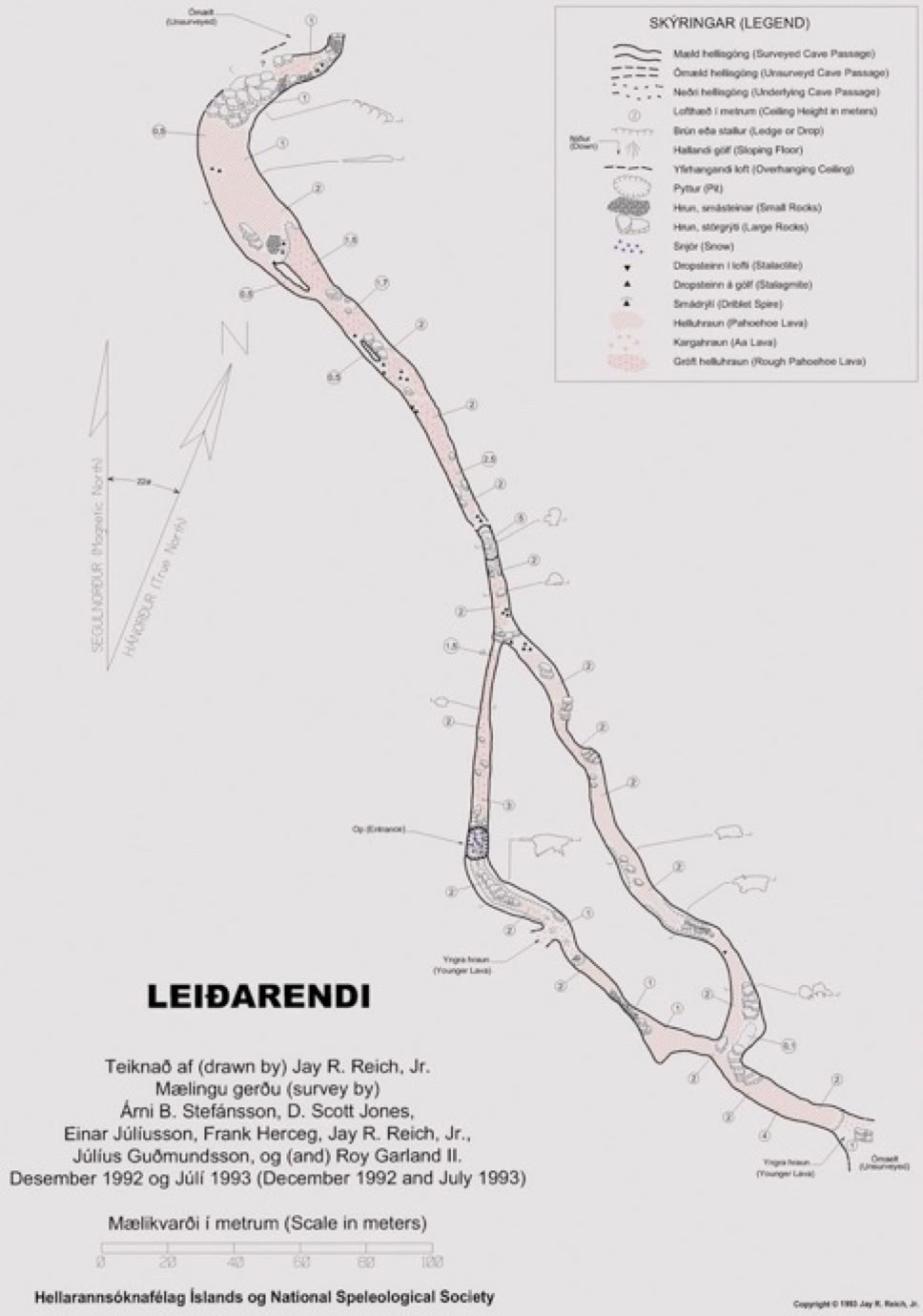 En octobre 2015, lors de notre voyage en Islande, nous avons exploré une petite section d’un tunnel de lave. Contrairement à Lanzarote, où les cavités volcaniques sont accessibles gratuitement, en Islande, tout est commercialisé. Une visite guidée de trois heures coûte environ 80 euros. Après quelques recherches sur Google Earth, nous avons trouvé un tube de lave sur la péninsule de Reykjanes : la grotte basaltique de Leidarendi. Située dans le champ de lave de Stora-Bollahraun, datant de 2000 ans, elle a été découverte en 1992. Le nom Leiðarendi, qui signifie en islandais « la fin du voyage », provient d’une carcasse de mouton trouvée au fond de la cavité. La grotte s’étend sur un peu moins d’un kilomètre.