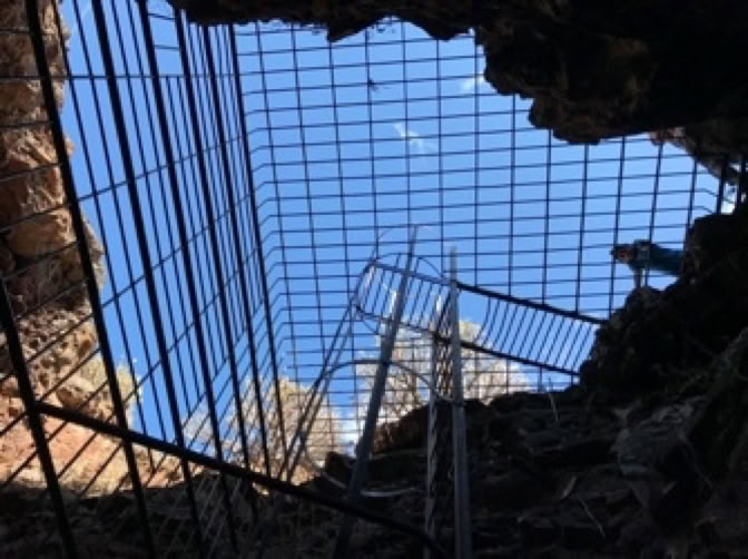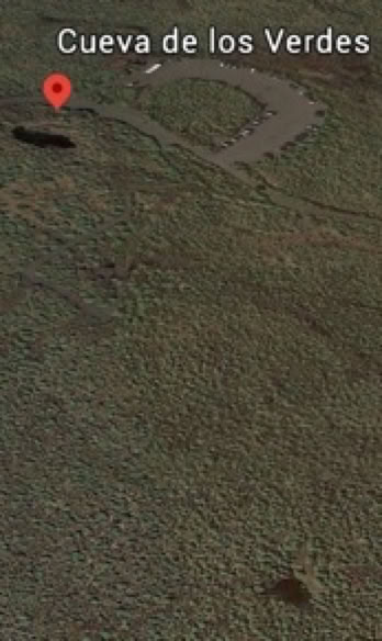 Rapidement, nous avons exploré une autre cavité, repérée la veille sur Google, près de la cueva de los Verdes. Son nom est inconnu. L’entrée est un puits d’effondrement, sécurisé par une porte fermée et un épais grillage, à travers lequel nous avons réussi à nous faufiler. Une échelle fixe d’environ dix mètres nous a permis d’atteindre un réseau de taille moyenne (5 à 10 mètres). En quelques minutes, nous sommes arrivés dans une belle galerie tubulaire semi-noyée de 4 mètres. En raison du manque de temps et d’équipement, nous n’avons pas poursuivi l’exploration. C’est peut-être un départ qui mène au célèbre tunnel de l’Atlantide..