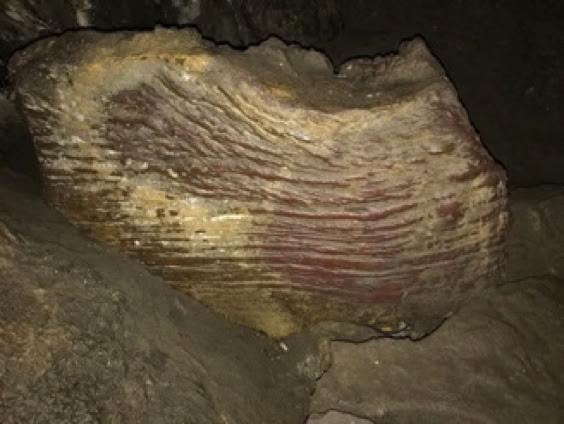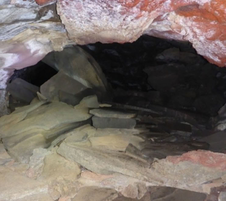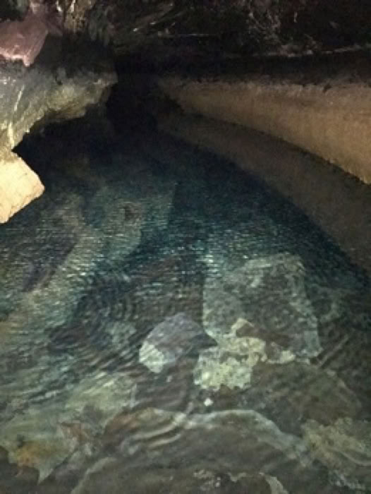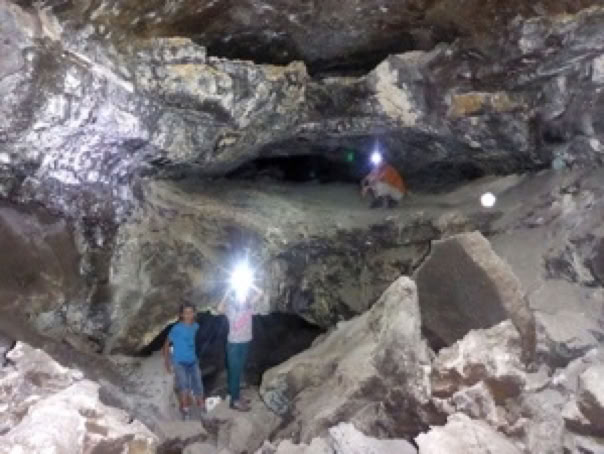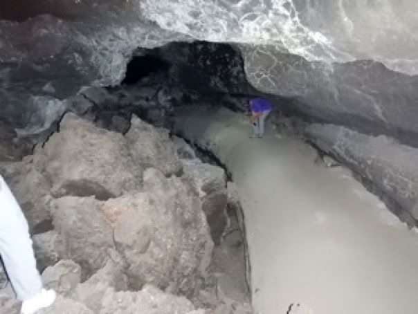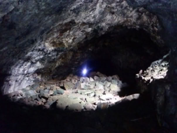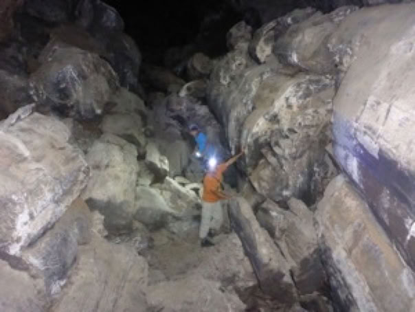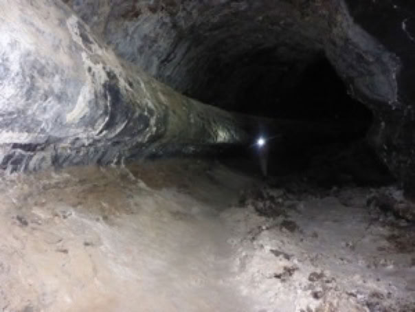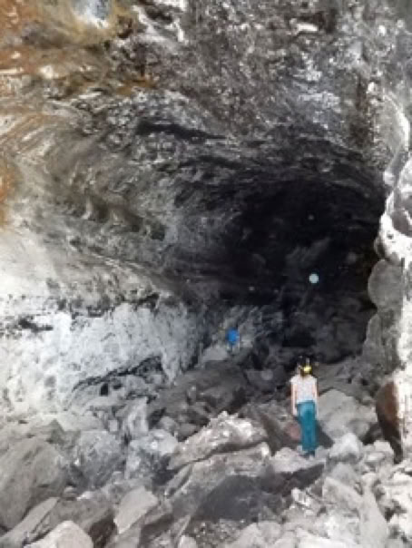 Les deux impressionnants porches des tunnels amont et aval s’élèvent à 50 mètres de hauteur. Nous avons exploré le réseau amont sur près d’un kilomètre. Il s’agit d’une large galerie d’environ trente mètres de diamètre, parsemée de blocs gigantesques et d’amas d’éboulis qui obstruent souvent le passage. Un fort courant d’air nous guide tout au long du chemin. Le parcours est bordé d’une large banquette, parfois surdimensionnée, qui illustre les différentes phases de formation de ce tunnel volcanique. Pressés par le temps, nous avons dû nous arrêter après un kilomètre dans un large et profond couloir mi-teinté de blanc, où le courant d’air reste omniprésent et la galerie est très spacieuse (15 à 20 m). Malheureusement, nous n’avons pas eu le temps d’explorer le réseau aval, qui semble tout aussi fascinant et impressionnant.