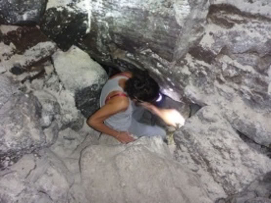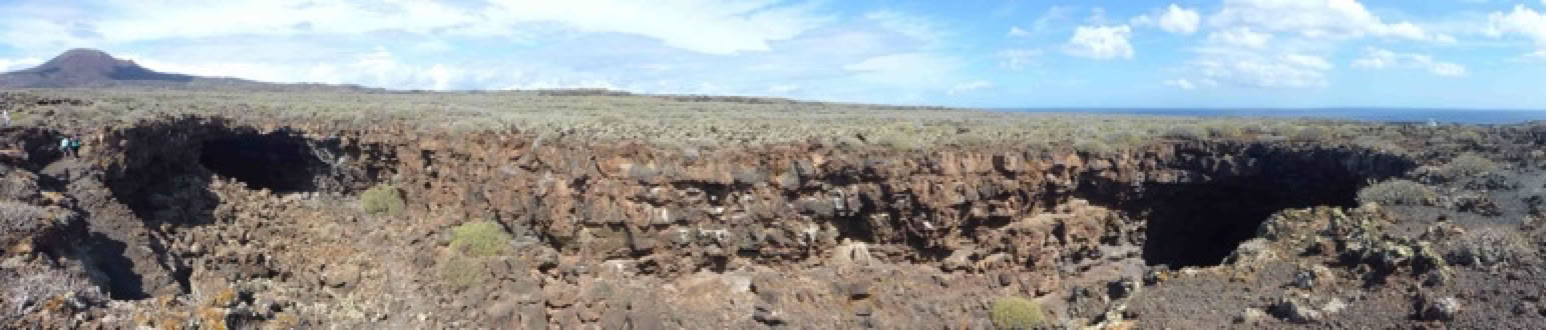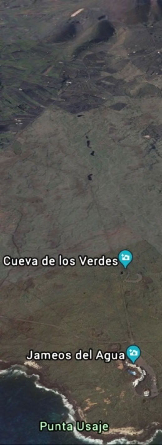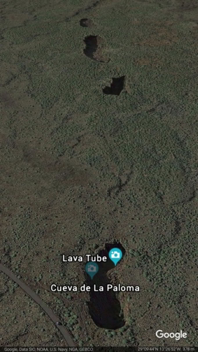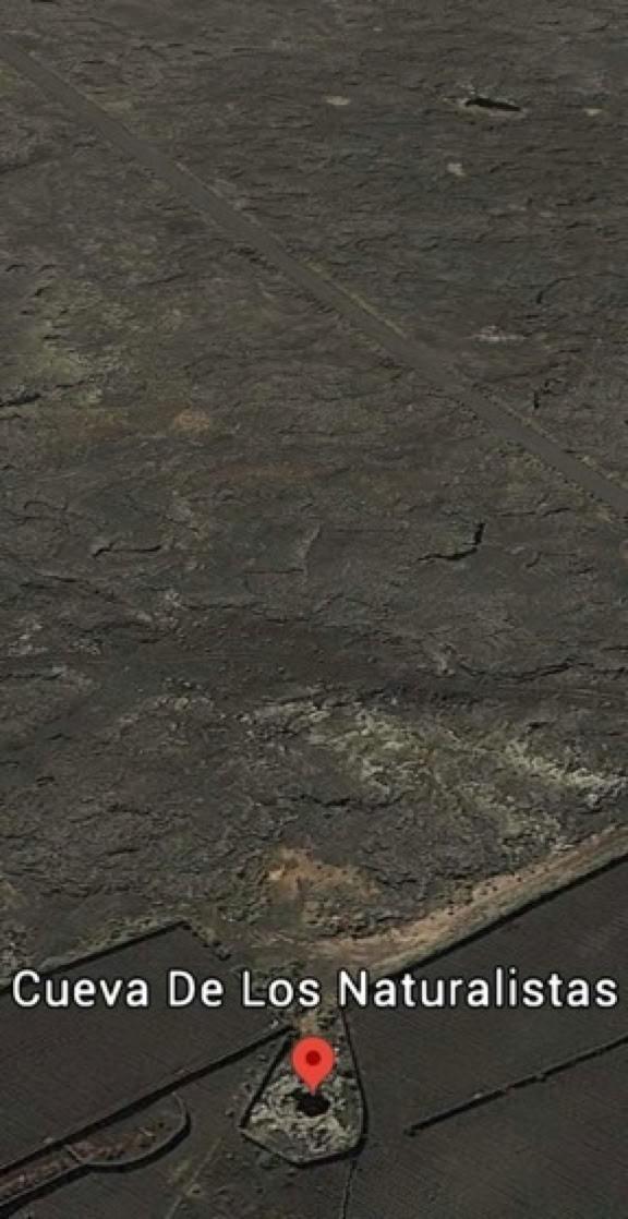 Grâce aux photos aériennes, nous avons identifié plusieurs cavités d’effondrement entre la cueva de los Verdes et le volcan de la Corona. Ces affaissements pourraient être des entrées potentielles dans la partie libre du réseau souterrain volcanique. Nous avons donc exploré la « cueva de la Paloma », comme elle est nommée sur Google Maps, située à 2 km en amont de la cueva de los Verdes. C’est une immense lucarne d’effondrement qui mène à deux réseaux : l’un en amont, vers le volcan, et l’autre en aval, vers los Verdes.