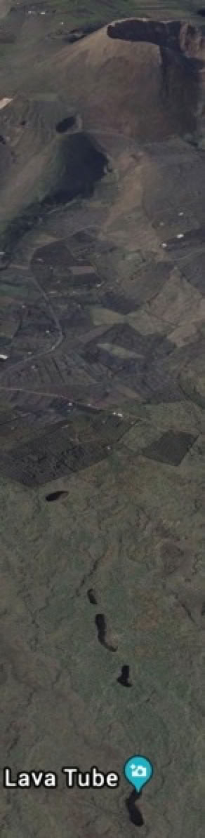 Par endroits le toit du tunnel de lave s’est effondré, laissant apparaitre une multitude d’entrée dite «lucarne» dans le réseau basaltique. Sur google Earth, on peut retracer le cheminement de la lave canalisée lors de l’éruption du volcan il y a 3000 ans.