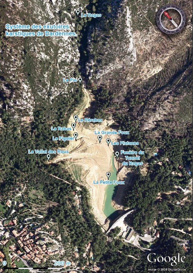 La première de ces sources, le Ragas, orifice d’un gouffre de 15 à 20 m de hauteur sur 5 à 10 m de large s’ouvre à la base d’une muraille calcaire où commence la vallée de Dardennes. Elle déverse dans un vallon lors des fortes pluies d’orages, d’énormes quantités d’eau, aussitôt disparues après les pluies.
