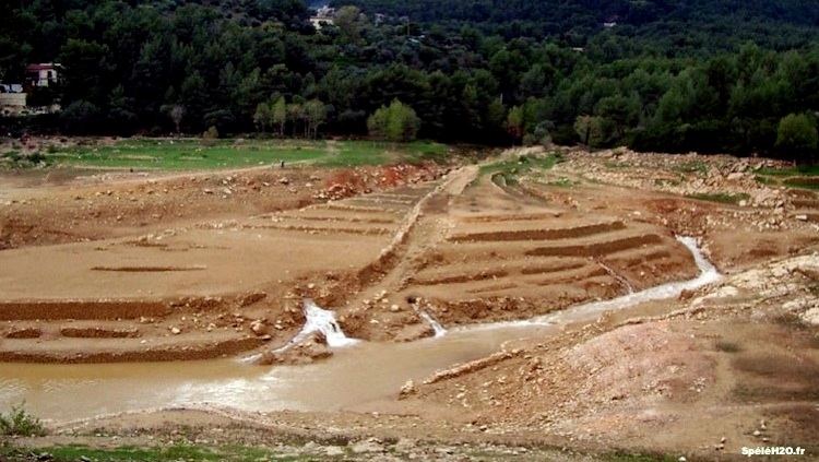 Depuis la construction du barrage en 1912, les sous-écoulements de ces sources sont noyés la plus grande partie de l’année. Lorsque le barrage est plein, l’eau se trouve à la cote 123 m mais en période de sécheresse, elle peut descendre à la cote 110 m.